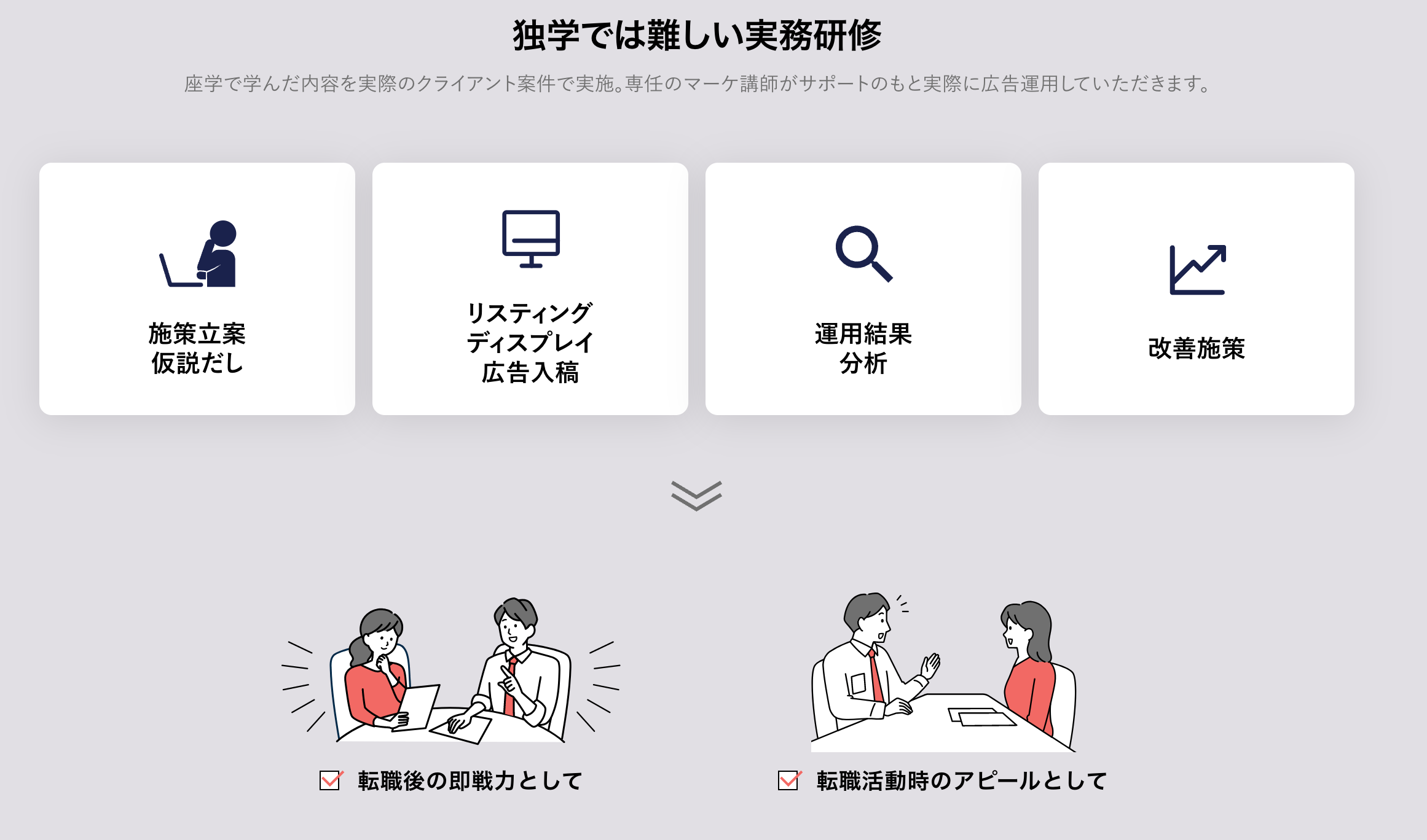「デジプロNEXT」は、6週間でWebマーケティングの提案から運用、改善、報告まで一気通貫で経験できる実践型研修コースです。受講者は実際の広告案件を担当するため、Webマーケティングの実務経験を積むことができ、卒業後のキャリア形成を促進します。また、コース受講中はプロのWebマーケターがチューターに入り受講生をサポート。受講生が安心して研修に取り組めるような学習環境を提供します。