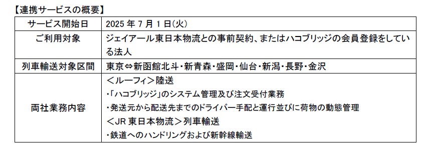 株式会社ジェイアール東日本物流(本社:東京都墨田区、代表取締役社長:野口忍、以下「ジェイアール東日本物流」)と株式会社ルーフィ(本社:東京都中央区、代表取締役社長:渡辺 泰章、以下「ルーフィ」)は、2025年7月1日よりジェイアール東日本物流が提供する列車荷物輸送サービス「はこビュンQuick」とルーフィの車両マッチングサービス「ハコブリッジ」が連携した即日輸送サービスを開始します