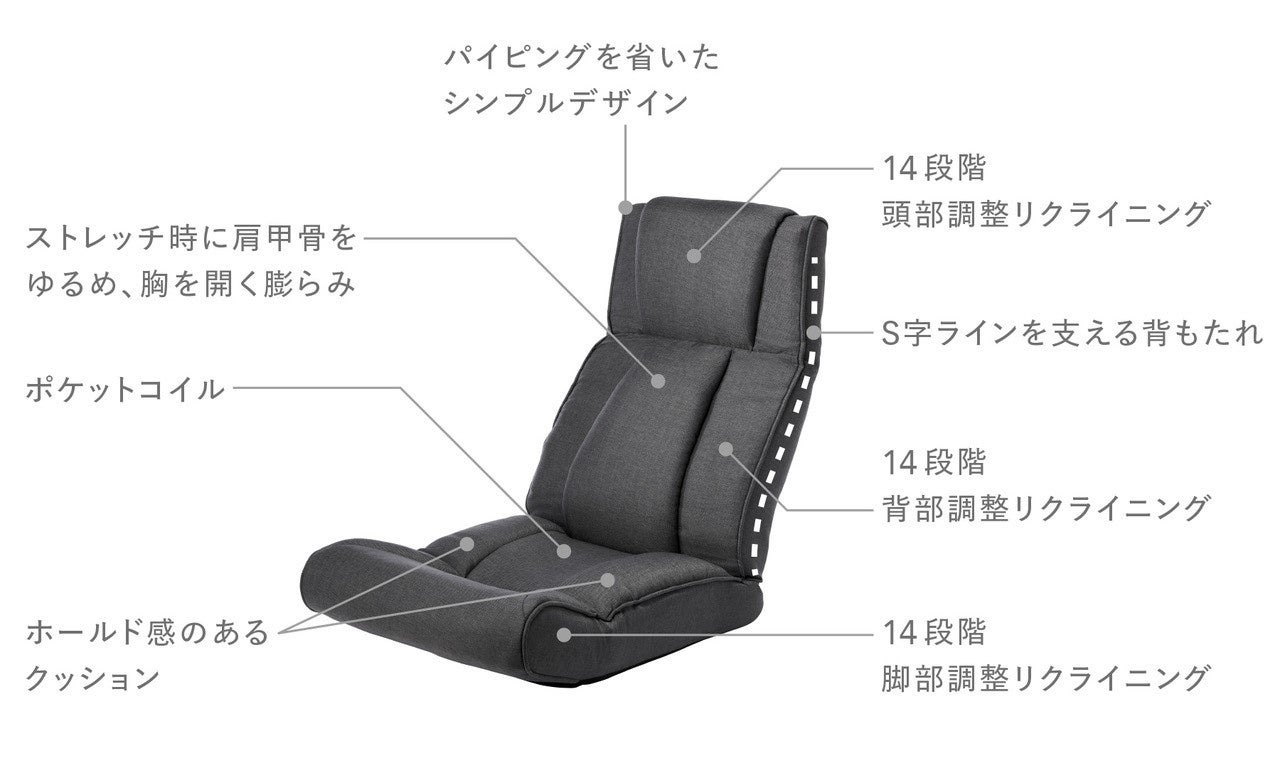 使う人に合わせてフィットするように頭部、背部、脚部それぞれ14段階の調節が可能。長時間座った際の圧力を分散させます。
