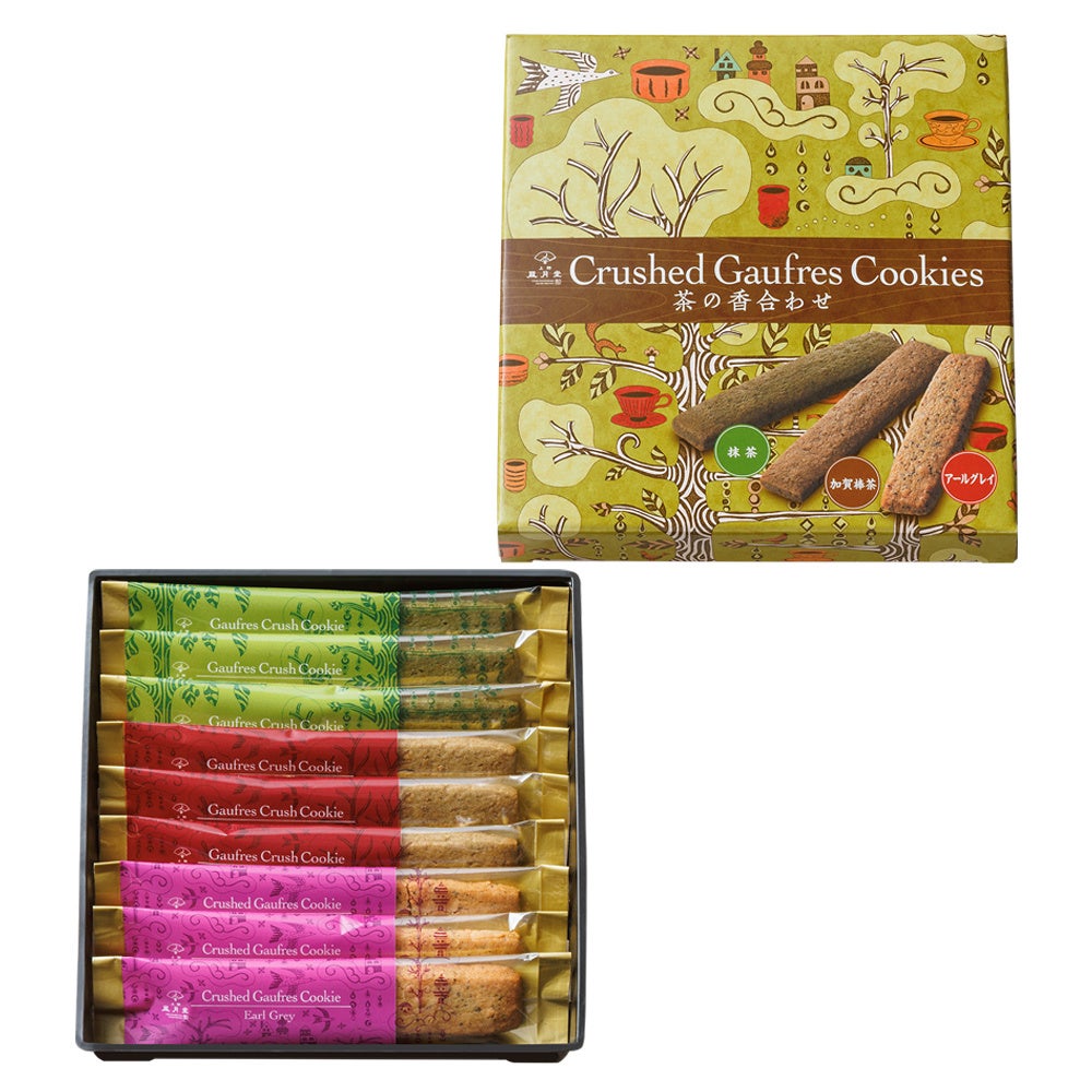 商品特長:「ゴーフルパウダー」をクッキー生地に練りこんだ、サクサクの食感が特徴の『ゴーフルクラッシュクッキー』から、香り高い3種類のお茶「抹茶」「加賀棒茶」「アールグレイ」の味をラインアップしました。