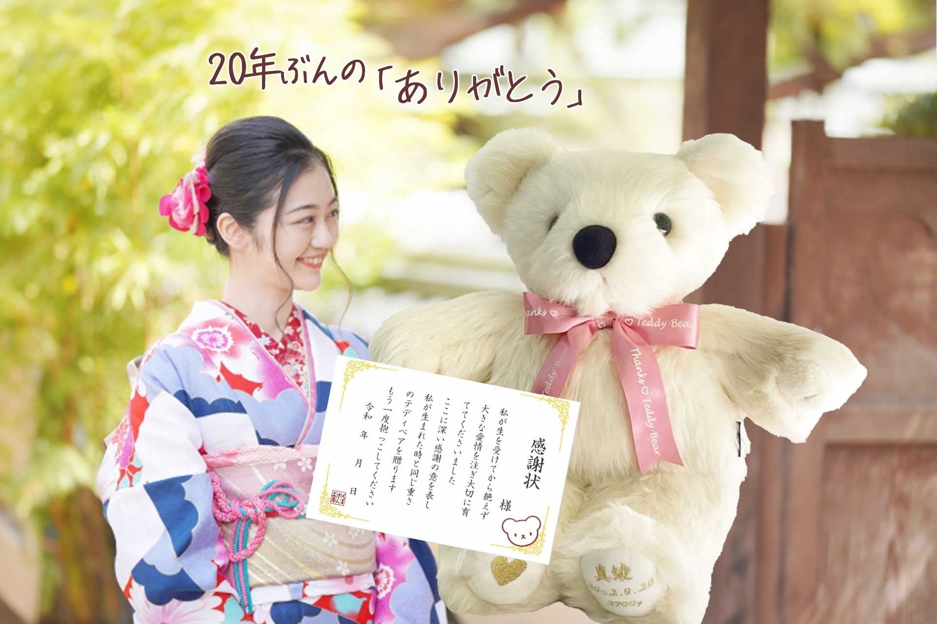 成人の日に、20年前の私を逆プレゼント!生まれた時の重さで作るテディベアでママパパに感謝を伝えます。「感謝状」がより感動を演出。Z世代の新成人に向けた特別な体重ベアのセット。12月1日受付開始