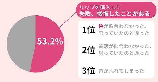 調査の結果、53.2%の女性が「リップを購入して失敗や後悔をしたことがある」ことがわかりました。また、その理由で最も多かったのは「色が似合わなかった、思っていたのと違った」という回答でした。