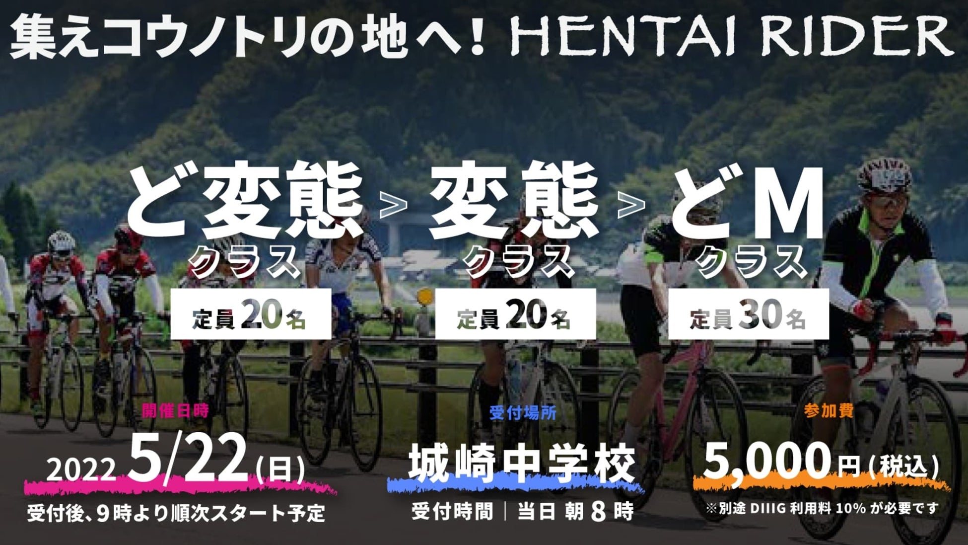 兵庫県豊岡市は山・川・海、大自然に囲まれた地域です。今回のコウノトリHENTAIライドは自然の中を同じロードバイクという共通の趣味を持つ仲間と駆け抜け、楽しみながら自分への挑戦をしていただきたいと思い企画しました。その挑戦を通して得た成功体験は自己成長や自己改革に変化し、新しい自分を見つけるきっかけになると信じています。グループに「変態」「ドM」などの言葉を使ったのは、これまでの大会参加者から「このコースを考えた人は変態だ!ドMに違いない」というお言葉を頂戴したからです。(コースを考えたのは私です)そんな変態が集まり、変態を育て、イベントを持続可能にしていくのが開催の狙いです。普段の練習の力試しをしてみたい、自分を変えたい。そんな方に是非参加していただきたい大会です。