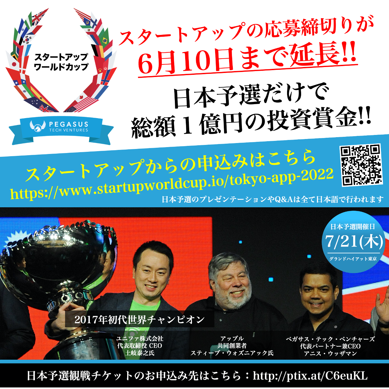ペガサス・テック・ベンチャーズ(本社:米国カリフォルニア州、代表パートナー兼CEO:アニス・ウッザマン)は、世界最大級のスタートアップピッチコンテスト「スタートアップワールドカップ2022日本予選」に出場するスタートアップを募集しております。「スタートアップワールドカップ2022」は優勝投資賞金約1億円を掛けて競い合う、世界最大級のスタートアップピッチコンテストです。日本代表を選出する日本予選を、7月21日(木)にグランドハイアット東京にて開催。書類選考を突破したスタートアップ10社が約3,000人の観客を前に、自社のビジネスプランのプレゼンを日本語でおこない、日本代表1社が選出されます。日本代表はその後、2022年9月28日から30日にかけてサンフランシスコで行われる世界決勝戦へと勝ち進みます。