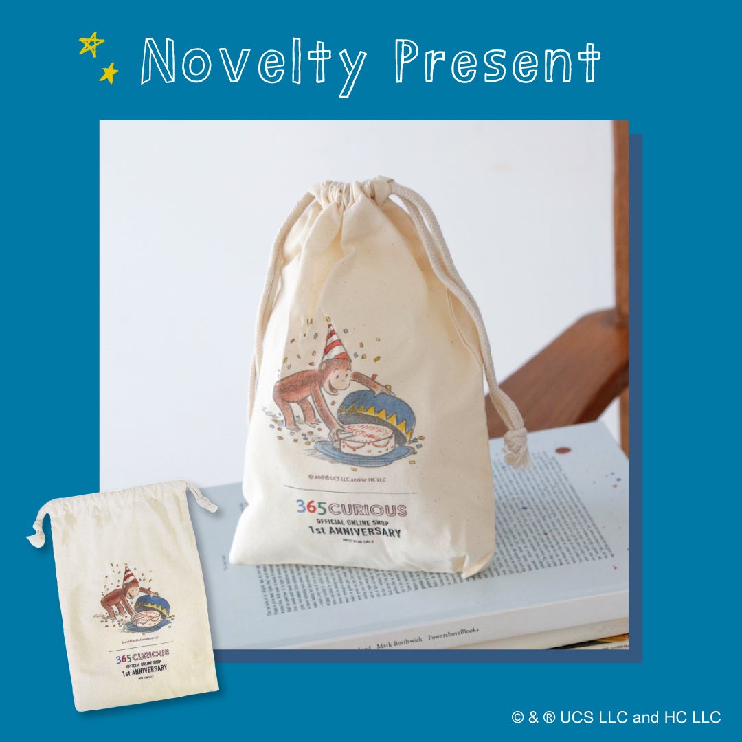 ざらりとした生地に1周年をお祝いするジョージのイラストがプリントされた巾着バッグです。