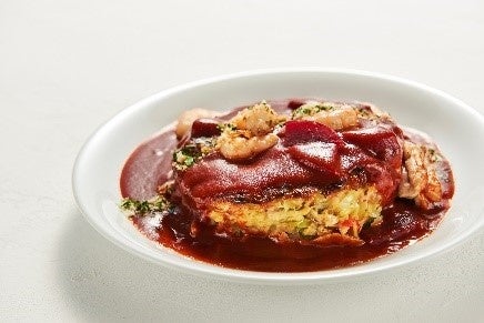 ふわっふわのお好み焼きの中からチーズがとろけ出し、ぷりぷりのエビと鶏肉の旨みがトマトの酸味がきいたデミグラスソースとチーズに絡みます。
