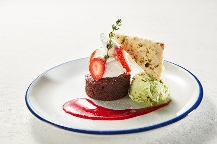 しっとりととろけるチョコレートケーキといちごが織りなす絶品スイーツ。サクッとした食感のクラフミルフェやピスタチオのアイスクリームと一緒に楽しめます。