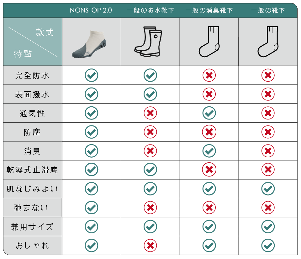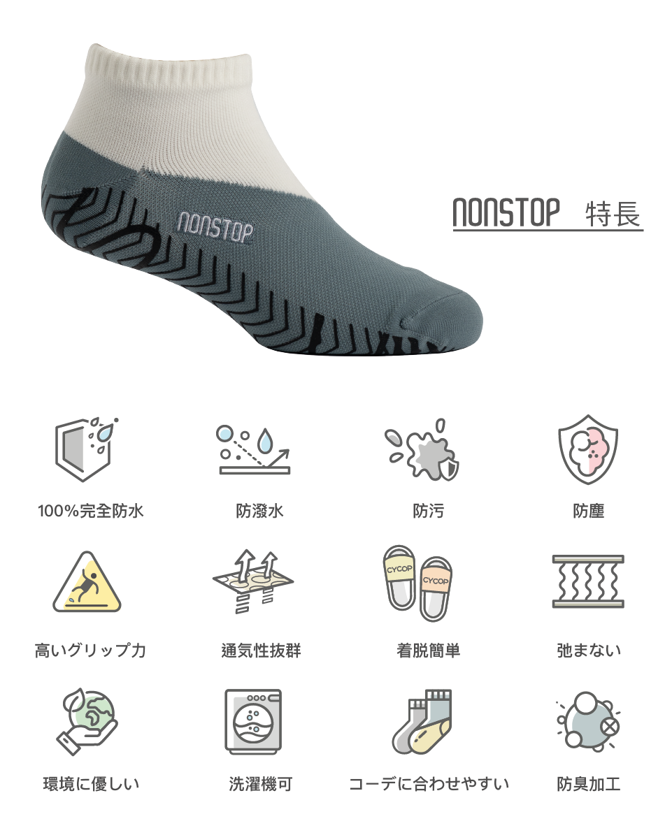 特許の「多層3D編み技術」を用い、100%防水の構造を実現し、滑り止め、通気と防臭効果も高い。靴を選ばずにソックスで完全防水することが実現する。