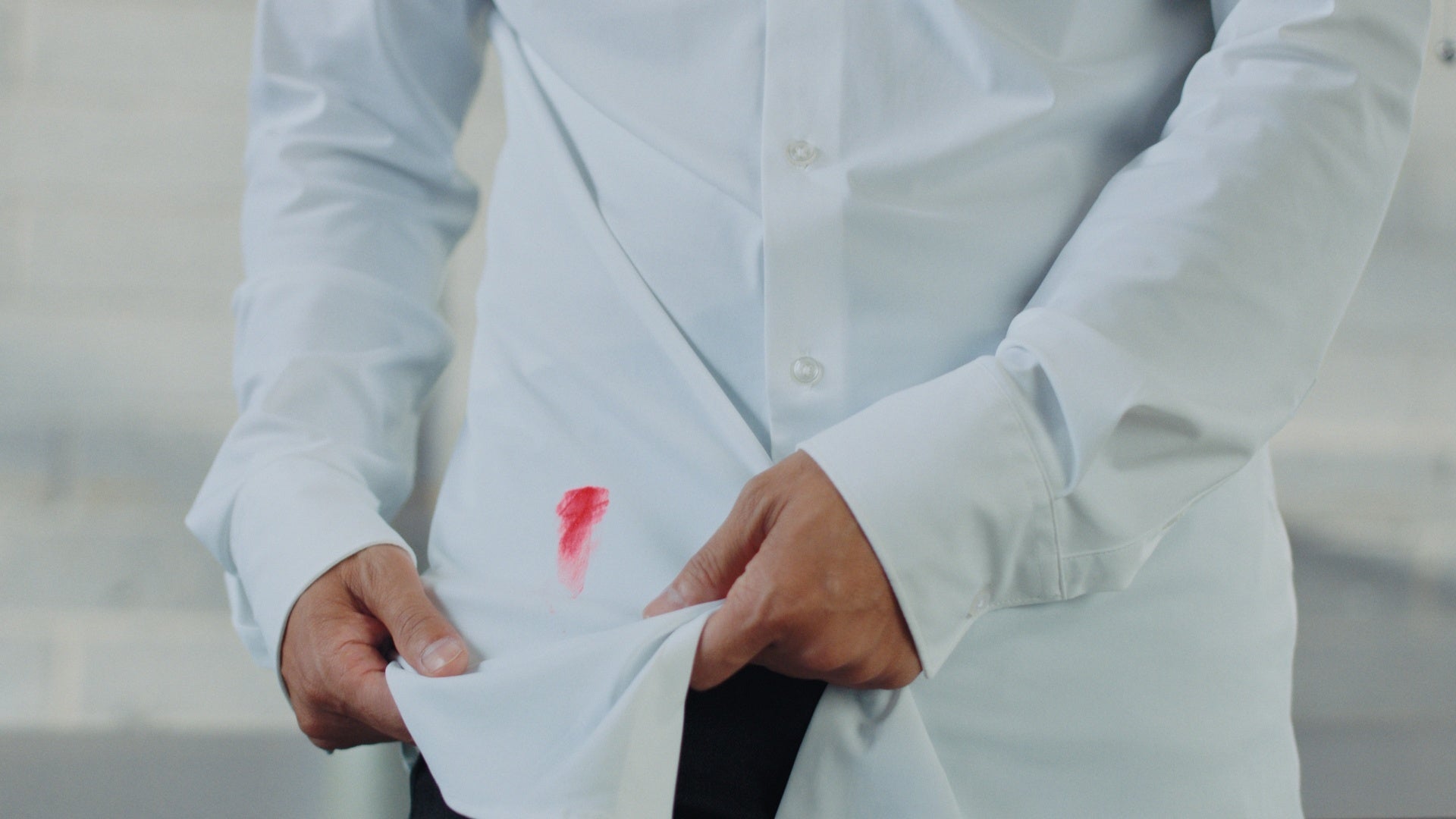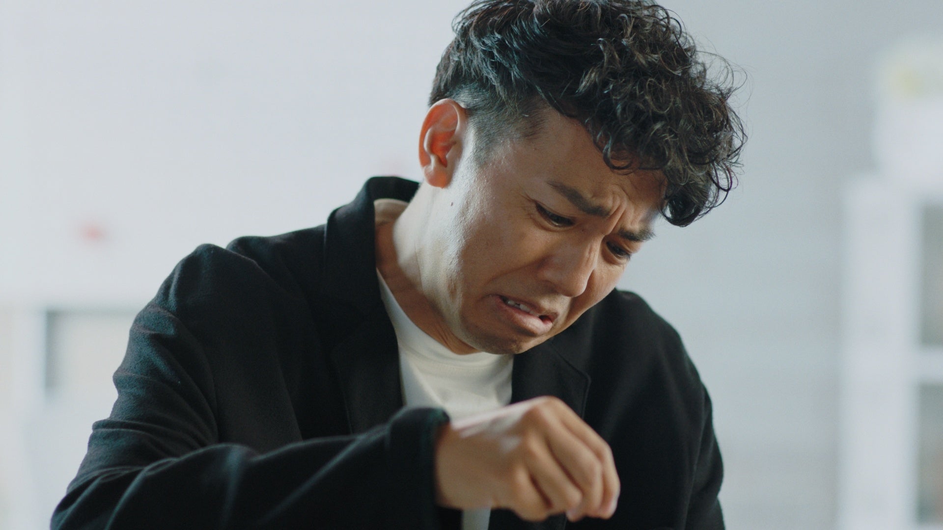 しかし、彼女は開口一番「なんか赤いの付いているよ」。新調したばかりの真っ白なシャツに朱肉がついってしまっているのに気づく綾部さん。