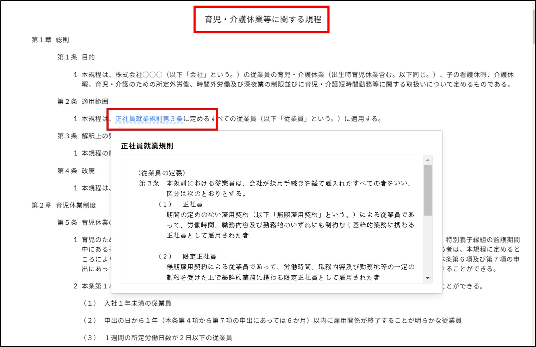 現在、本機能に対応している規程種別は「就業規則」、「育児・介護休業等に関する規程」の2種類で、順次拡大予定です。