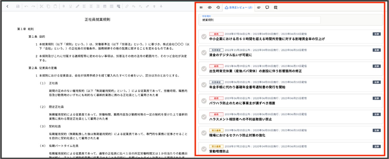 通常、法改正が施行した際には、法改正の内容や施行のスケジュールを担当者が理解した上で、運用している社内規程内のどこに修正が必要な条文があるのかを目視で探し、手作業で適した文言に改定する必要がありました。