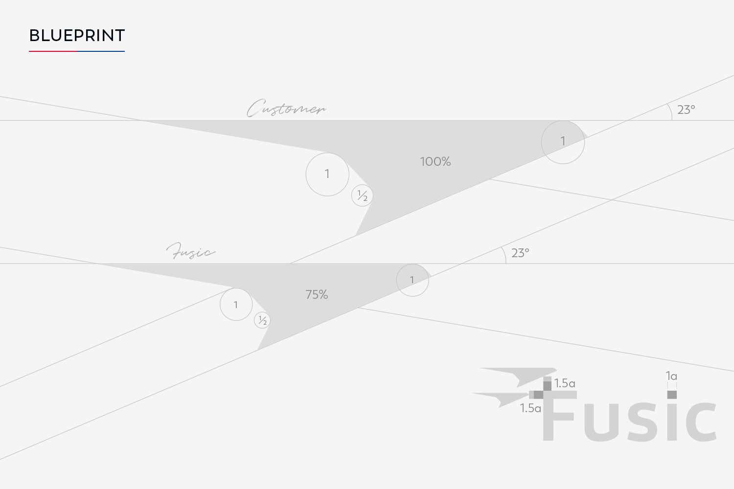 新しいロゴデザインは、社名の頭文字であるFをベースに、私たちが世の中に残す『爪跡』、そして未来に向かって突き進んでいく様子を表現しました。二つの飛行体は、テクノロジーの力で成功を目指すお客様と、そのために伴走するFusicの姿でもあります。飛行体の胴体の角度は2003年創業、2023年上場の沿革に基づいて23度とし、「驚きの角度」にちなんだ遊び心を加えました。