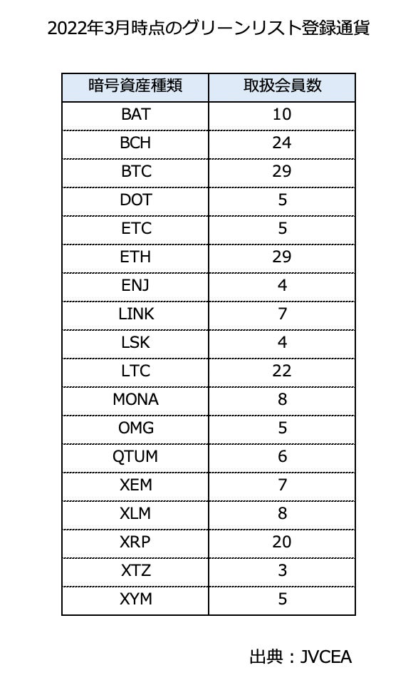 JVCEAは、国内での暗号資産の取扱状況に基づき、以下4つの条件を全て満たす銘柄を「グリーンリスト」として登録しています。