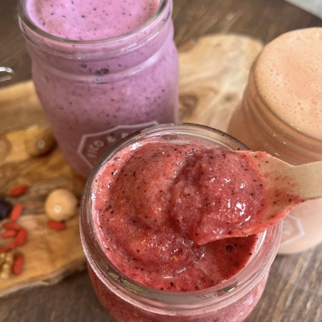 ・原材料:ストロベリー/バナナ/プレーンヨーグルト/有機豆乳/有機アガベシロップ/ジンジャーパウダー/ドライゴジベリー