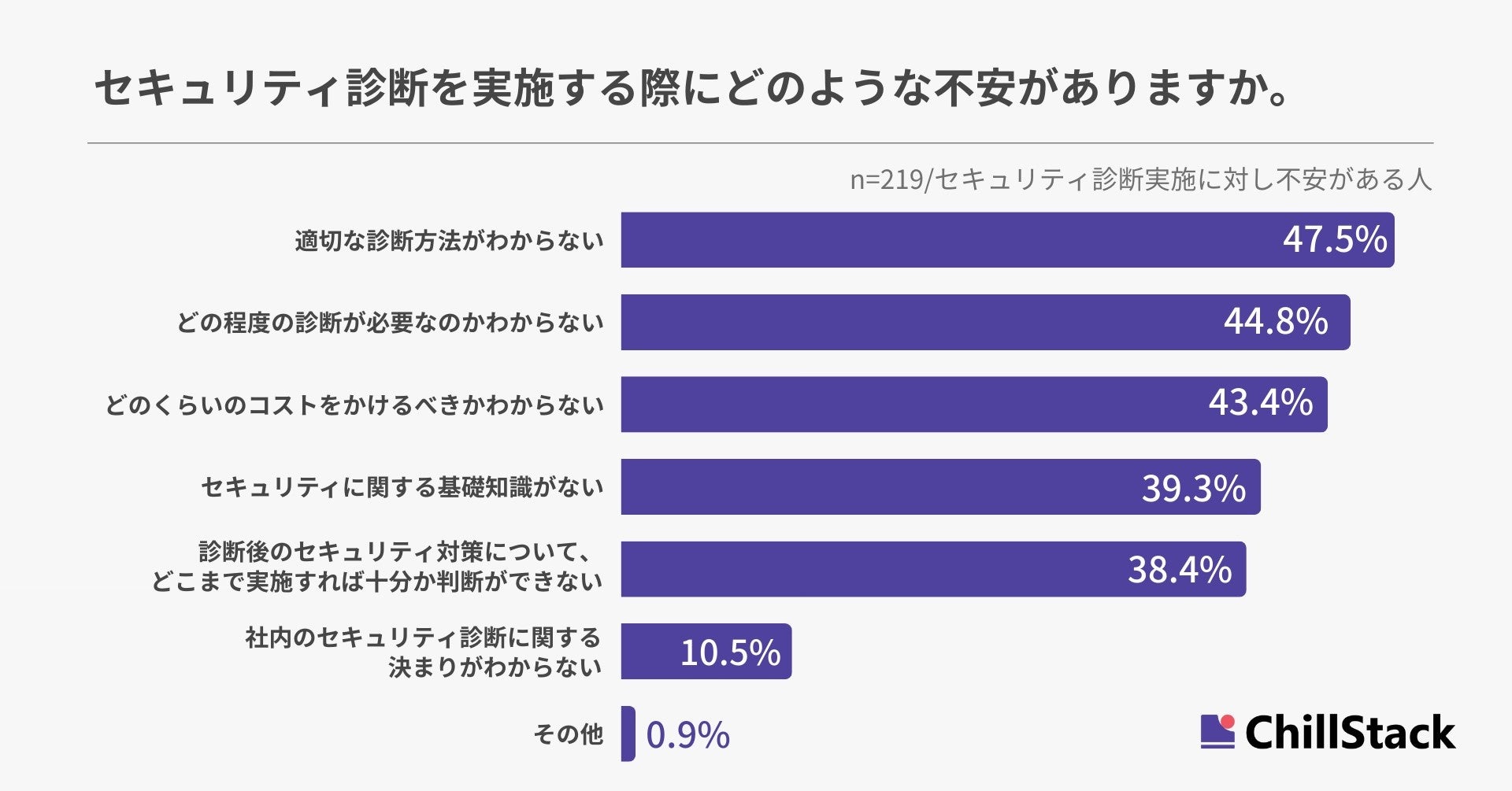 セキュリティ診断の実施に際し、どのような不安があるか尋ねたところ、「適切な診断方法がわからない」が47.5%で最も多く、「どの程度の診断が必要なのかわからない」が44.8%、「どのくらいのコストをかけるべきかわからない」が43.4%と続きました(n=219/セキュリティ診断実施に対し不安がある人)。