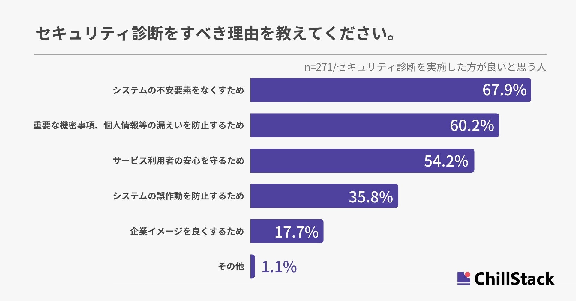 セキュリティ診断をするべきだと思う理由を尋ねたところ、「システムの不安要素をなくすため」が67.9%で最も多く、「重要な機密事項、個人情報等の漏えいを防止するため」が60.2%、「サービス利用者の安心を守るため」が54.2%と続きました(n=271/セキュリティ診断を実施した方が良いと思う人)。