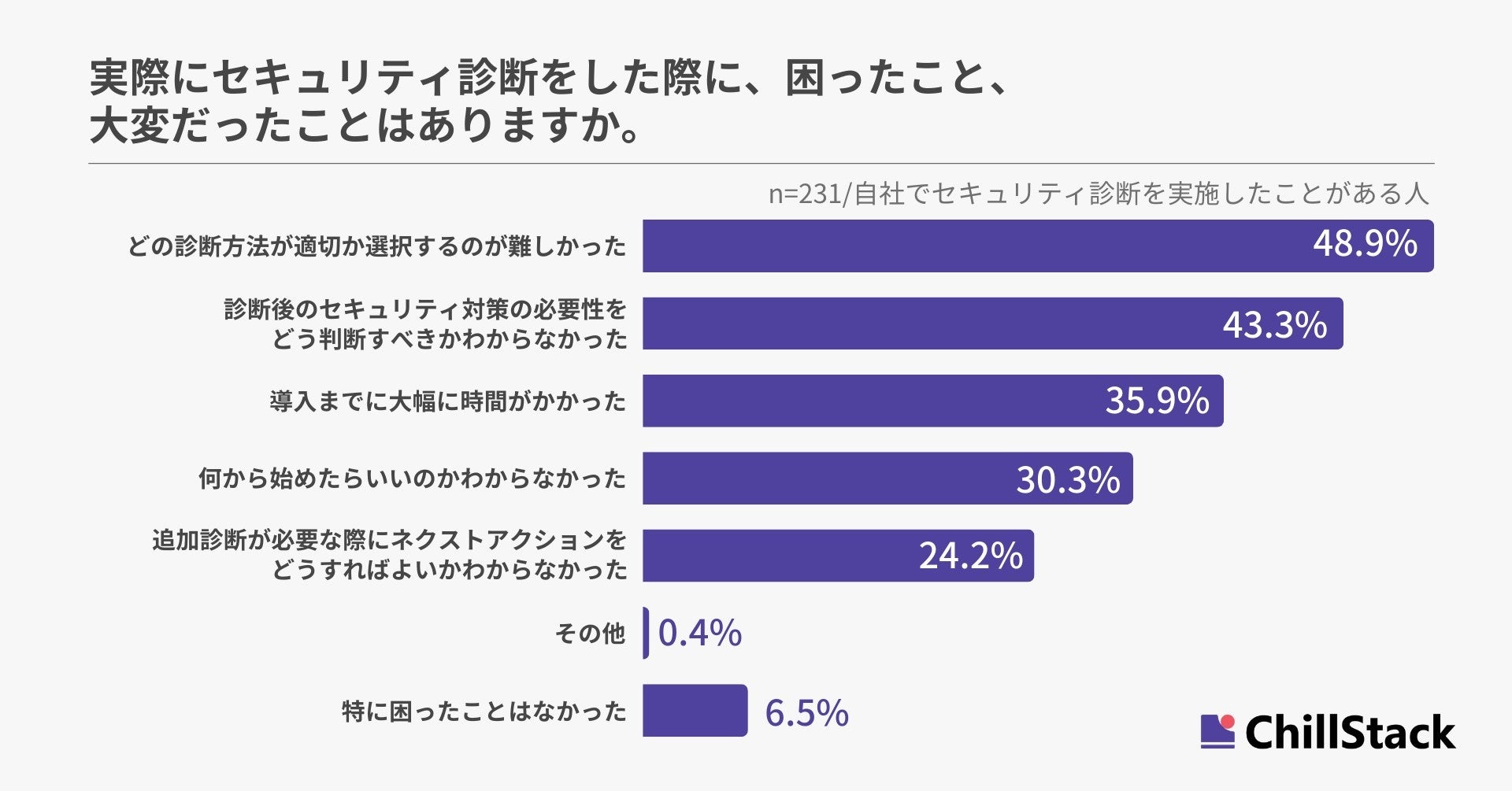 実際にセキュリティ診断をした際に、困ったこと・大変だったことを尋ねたところ、「どの診断方法が適切か選択するのが難しかった」が48.9%で最も多く、「診断後のセキュリティ対策の必要性をどう判断すべきかわからなかった」が43.3%、「導入までに大幅に時間がかかった」が35.9%と続きました(n=231/自社でセキュリティ診断を実施したことがある人)。