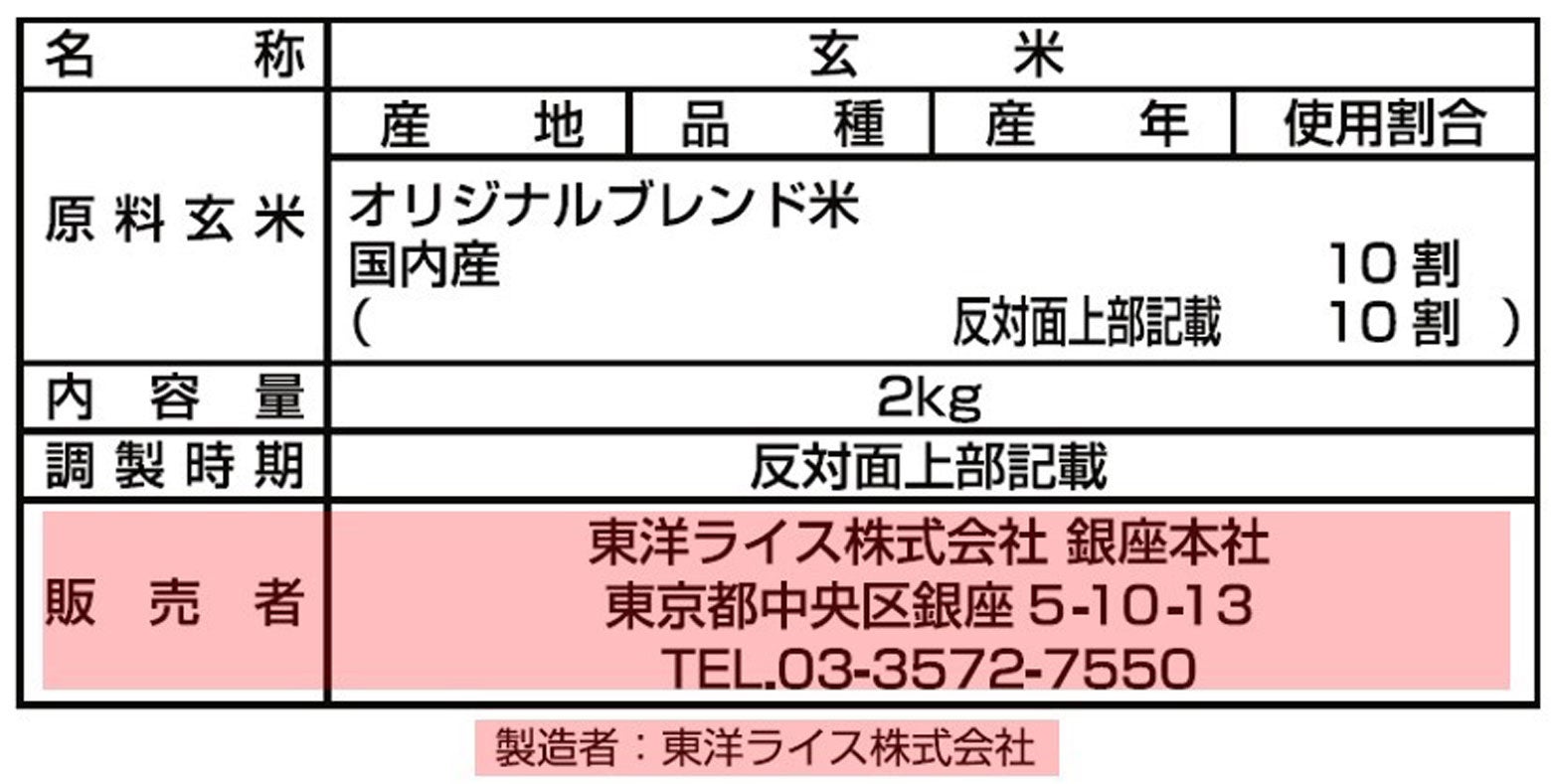 ●「販売者」または「製造者」として「東洋ライス株式会社」と明記