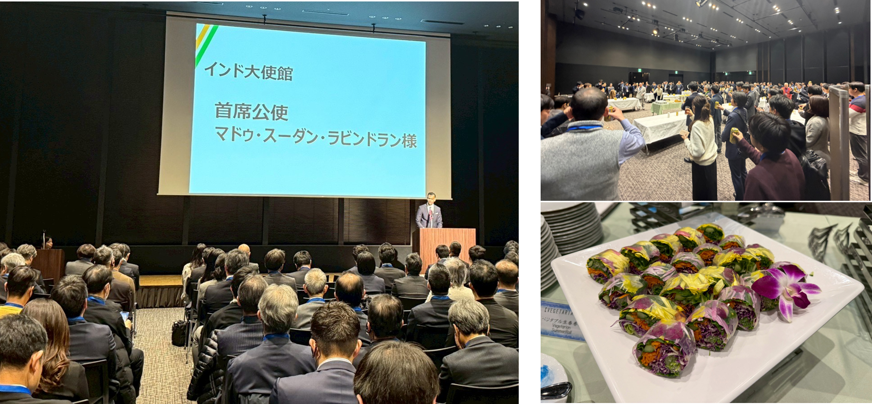 イベント冒頭には、前回に引き続きご後援いただいているインド大使館にご挨拶をいただき、その後、既にインドへ事業進出している企業計5社が事業に関するプレゼンテーションを行いました。加えて、イベント終了後の懇親会では、ベジタリアン向けメニューを含む多彩な料理に舌鼓を打ちながらインド事業に関する知見やノウハウを共有しました。