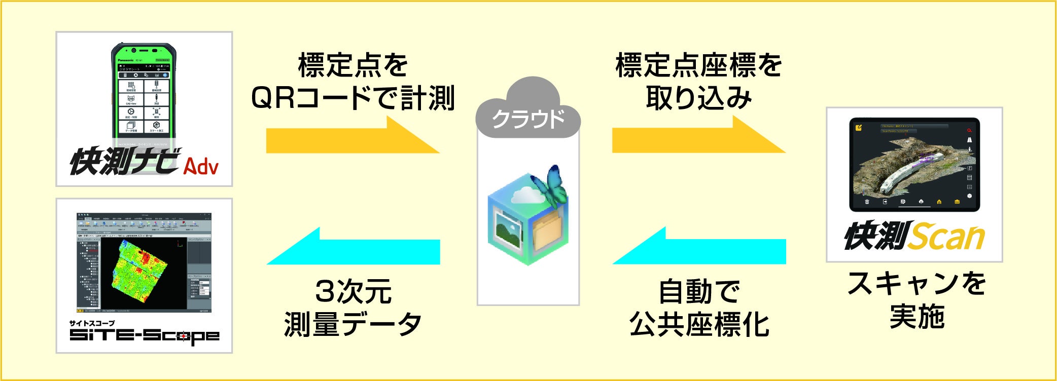 クラウドサービス「KSデータバンク」を介して、ICT施工現場端末アプリ「快測ナビAdv」と3次元施工データ作成支援ソフト「SiTE-Scope」と連携。標定点をQRコードで計測し、公共座標化したデータを3次元測量データとして活用。作業効率がアップし、よりスムーズな業務が実現します。