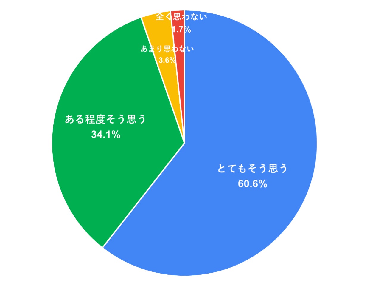 ・質問「頭部を守るためにヘルメット着用は有効だと思いますか?」に対しては60.6%が「とてもそう思う」、34.1%が「ある程度そう思う」と、94.7%がヘルメットの有効性を感じています。
