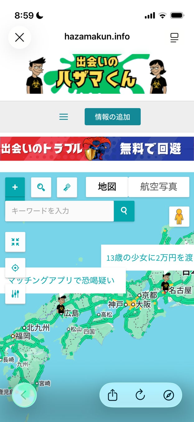 出会いの信用情報サービス「カスタネット」の企画・監修を担当する東京都認証特定非営利活動法人 結婚相談NPO(所在地:東京都武蔵野市吉祥寺南町)は、出会いのトラブル情報をハザードマップに共有する事で、事件・トラブル等の事前回避を目指す利用料無料Webサービス「出会いのハザマくん」( https://hazamakun.info/ )を公開しました。
