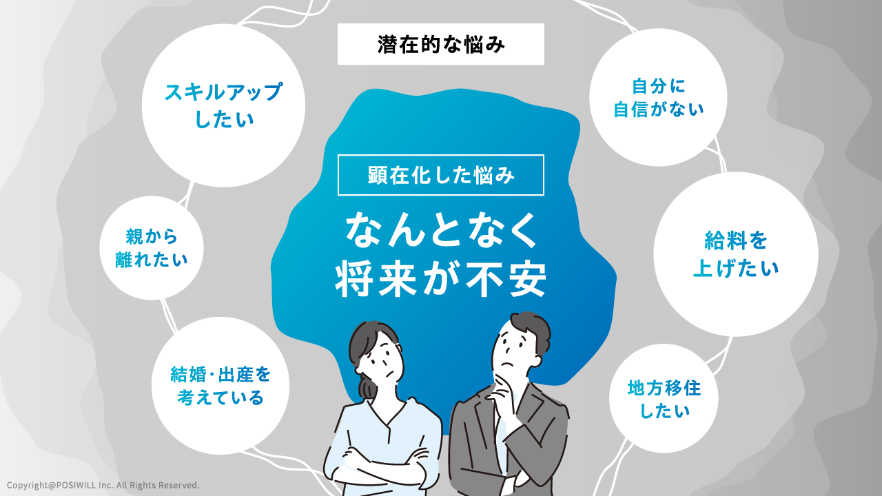 私たちは、これまで累計1万人以上の方々のキャリア形成に寄り添ってきたなかで、”人々の悩みは複雑に絡み合っている”ことを感じてきました。「なんとなく将来が不安」という悩みを紐解いていくと、仕事だけでなく、ライフイベント、人間関係、親子関係、お金...などさまざまな悩みが絡み合い、何から解決していけばいいのかわからない状態になっている人が多いのです。