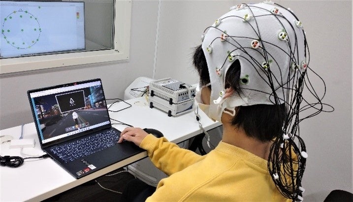 赤木研究室は情報システム工学科の田村研究室と協力して、メタバースでの学習が学生に与える効果について脳科学の分野からも調査しています。脳が活動するときに生じる「脳波」を計測し、脳の働きを客観的に計測する研究に取り組む田村研究室とともに、仮想空間での学習中に脳波の動きを計測。メタバースでの学習で感じる没入感やワクワク感がどのように学びに影響するのか。脳の状態から客観的に把握して、より良い学び空間の構築を目指しています。