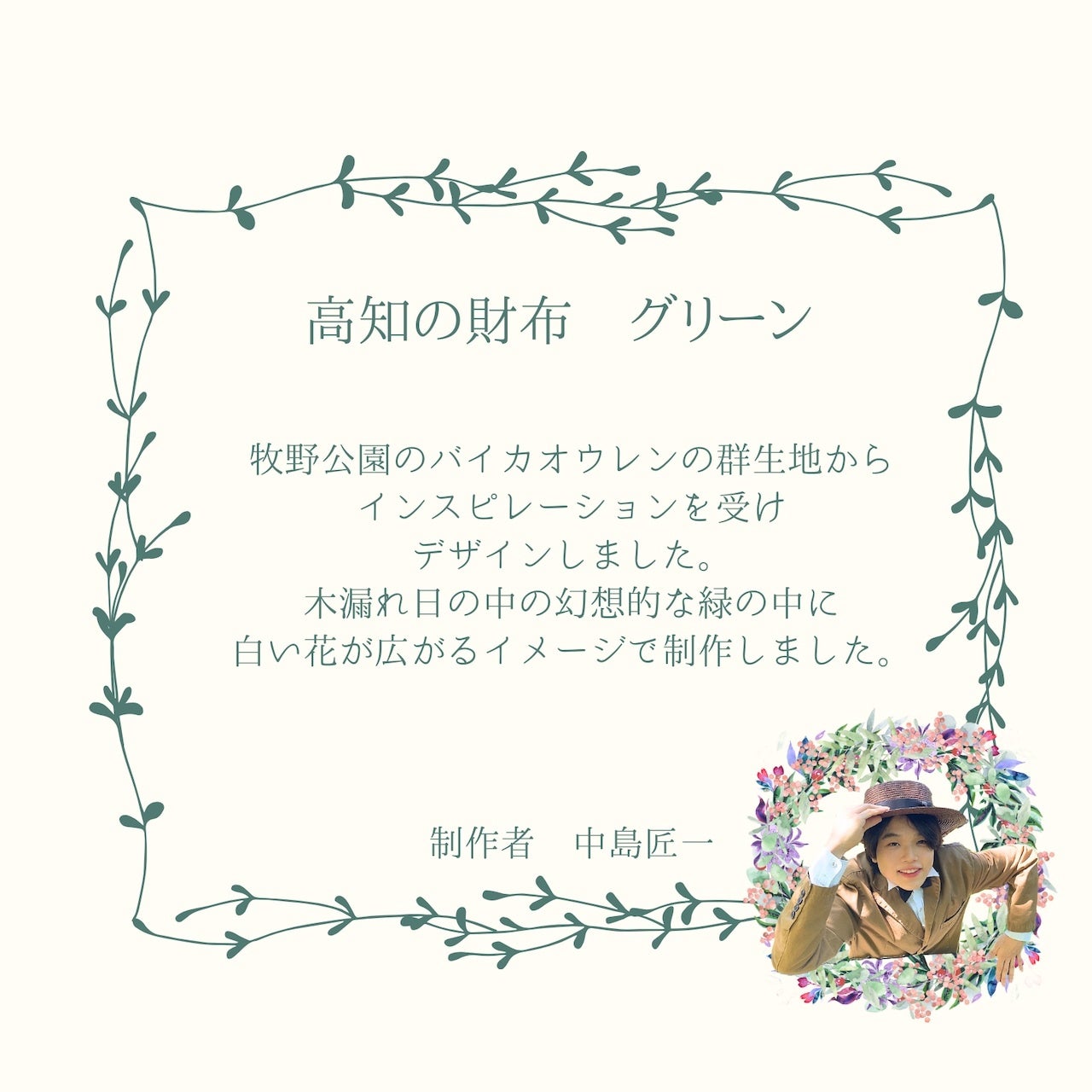 高知県佐川町の牧野公園や加茂地区で見ることのできるこの可憐な花は、深い緑と純白のコントラストが美しく、雪解けの頃に咲くその姿が多くの人々を魅了しています。この財布は、その自然美を再現しつつ、古来から金運を呼び込むとされる緑色を採用。シンプルながらも特別感のあるデザインとなっています。