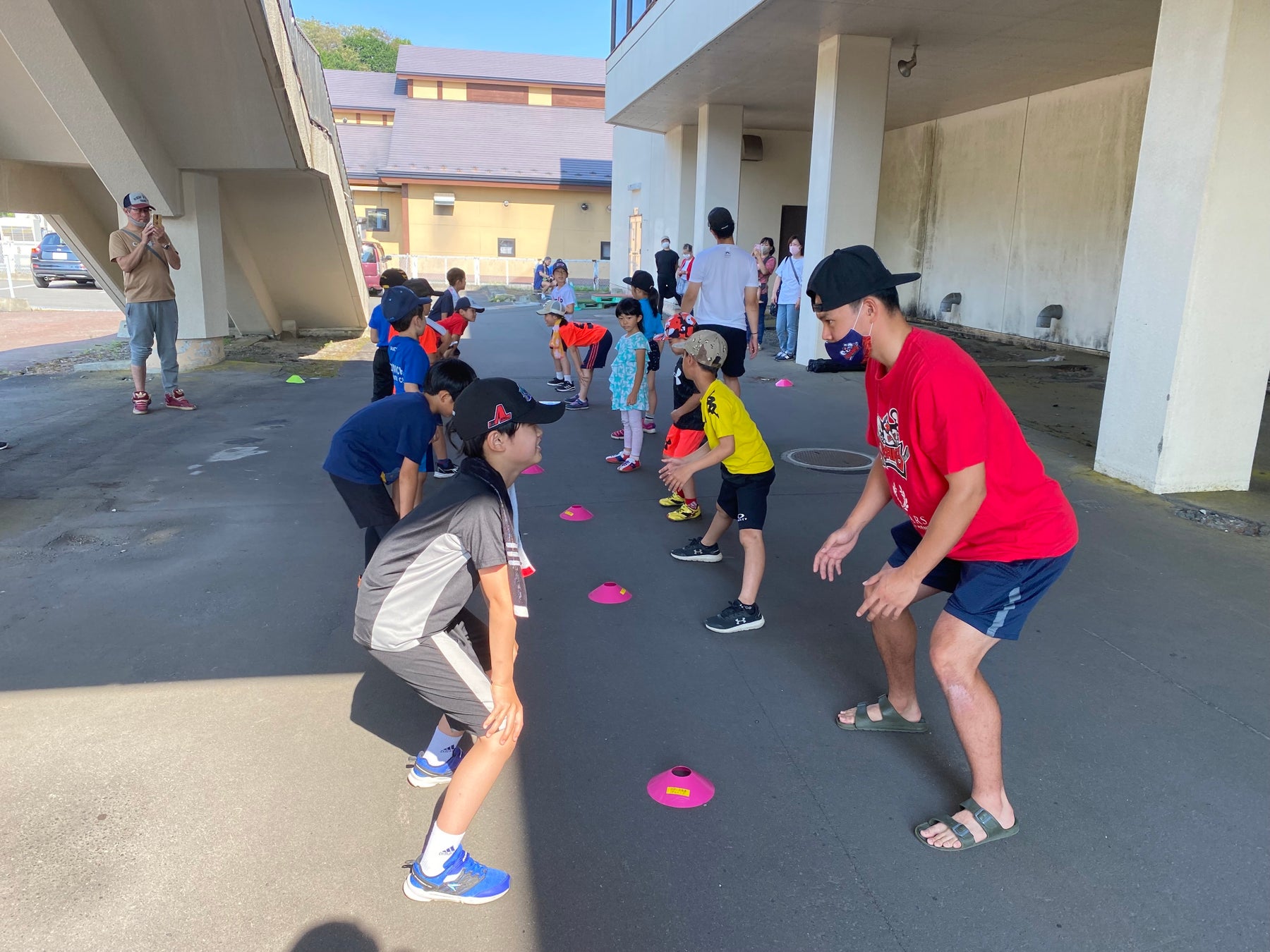 ステーションドリルを行い、ゲームシチュエーションを想定したドリル(1-0, 1-1, 2-0, 2-1, 2-2)をもとに練習メニューを組み立て、クレインズ選手の視点から場面ごとにあった状況判断のフィードバックを行います。