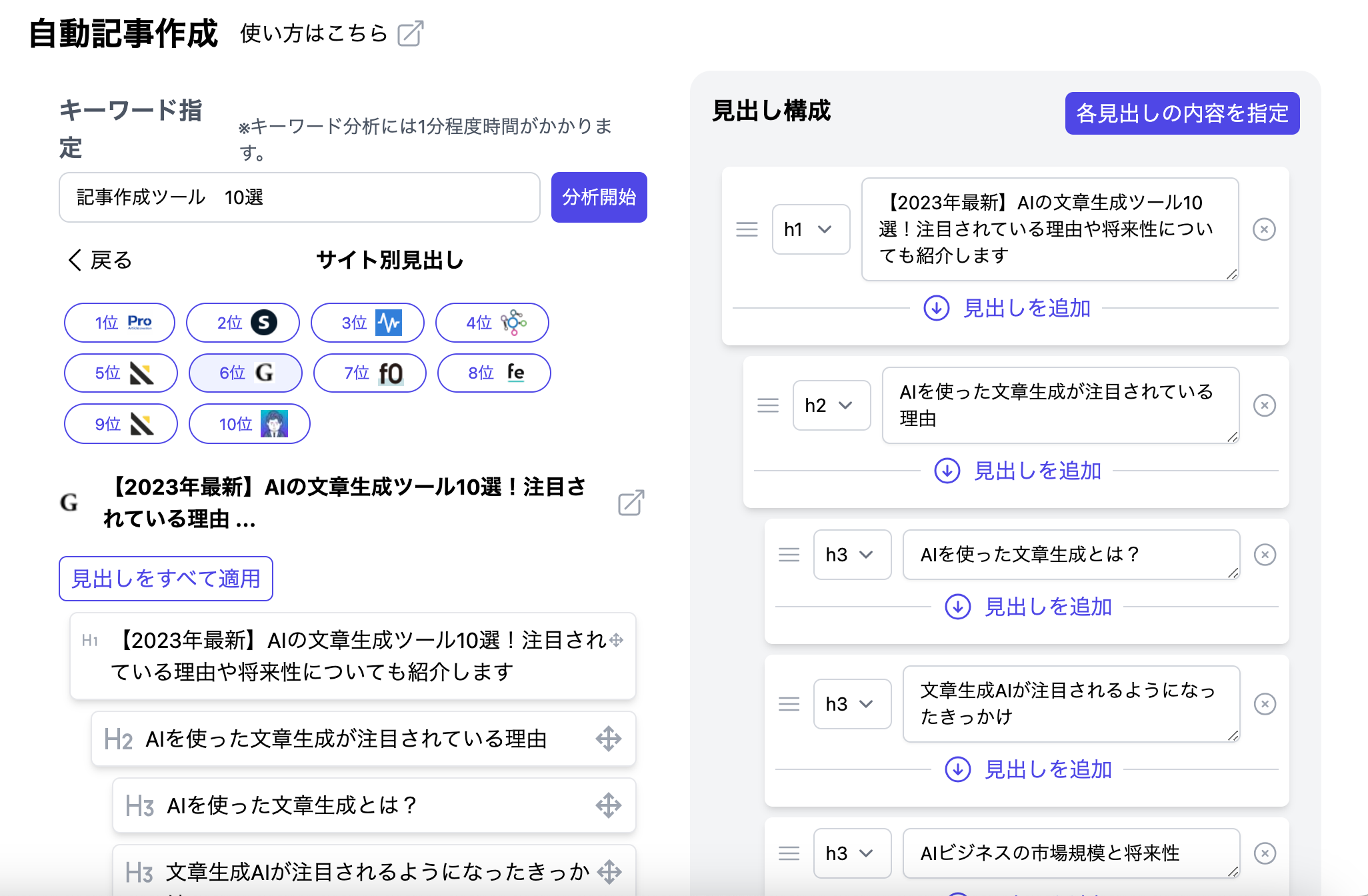 SEOの観点も考えられている上位記事を分析することで、見出し(H1,H2,H3タイトル)を自動作成!