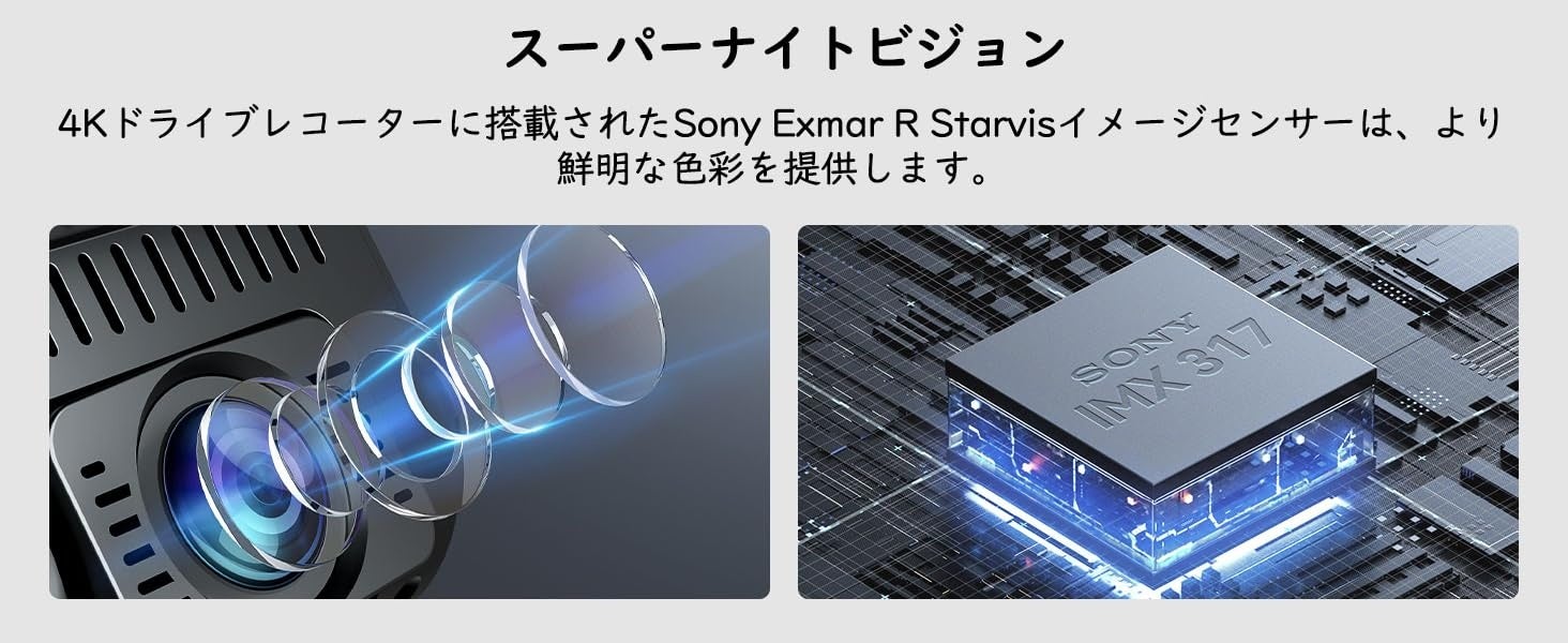 イメージセンサー | 【フロント】Sony Exmor R 8MP IMX317 / 【リア】Sony STARVIS CMOS 2.13M IMX291 |