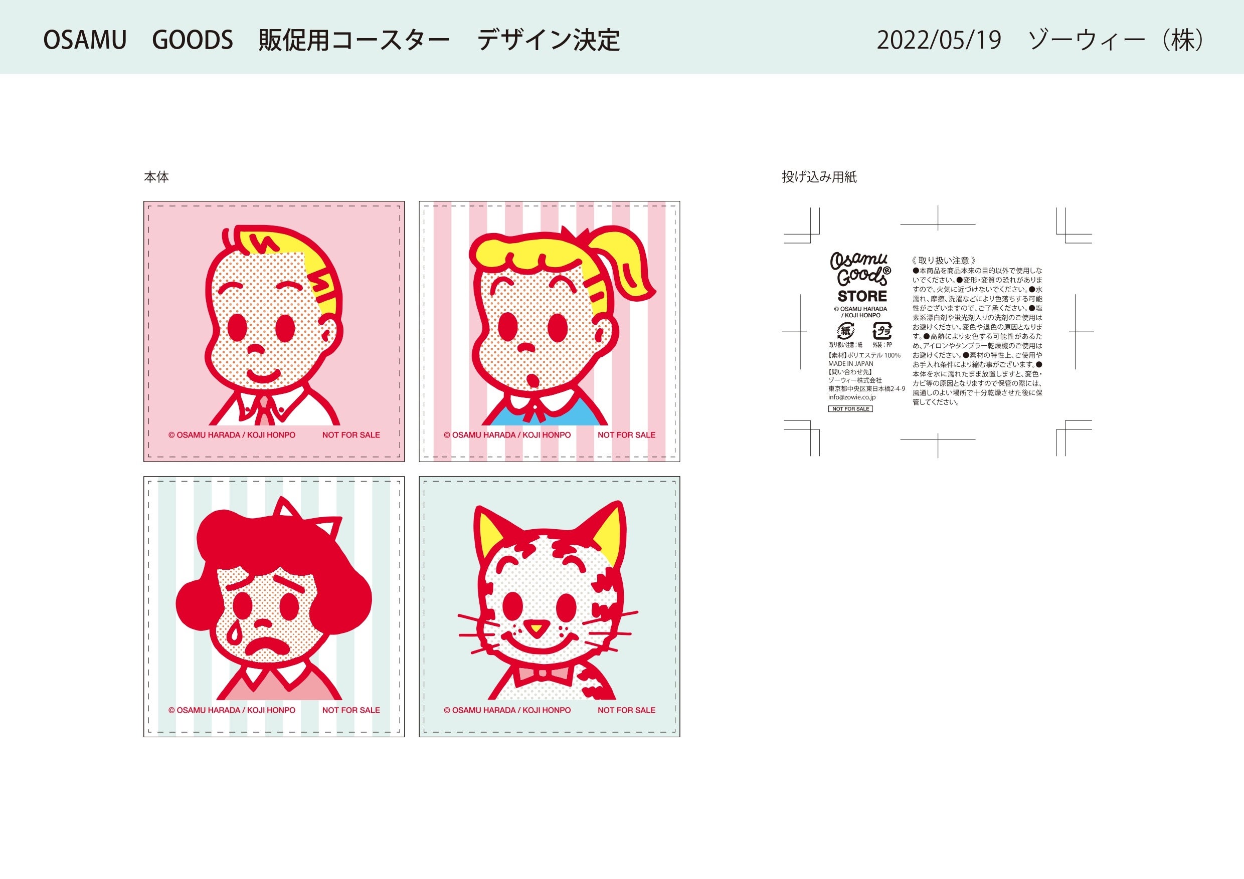 ② OSAMU GOODS STORE 会場で税込5,000円以上お買い上げのお客様に、期間中毎日先着100名様に『オリジナルコースター』をプレゼント。 ※図柄は4種類。図柄はランダムで選べません。