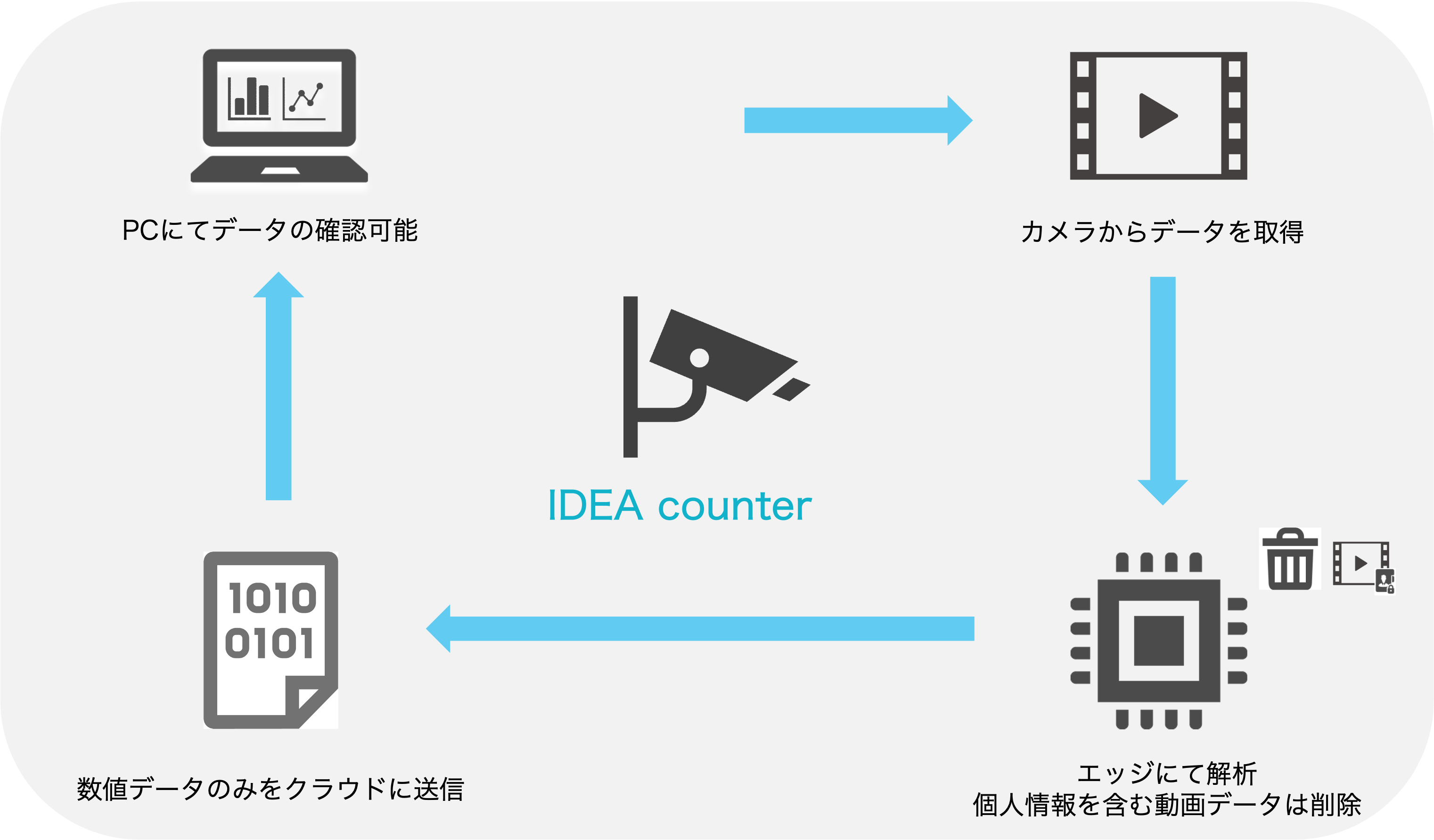 なお、「IDEA counter」はAI解析をエッジ処理で行うため、個人情報は取得せず、カメラの中で統計化されたデータになるため、個人情報保護にも配慮した設計となっています。