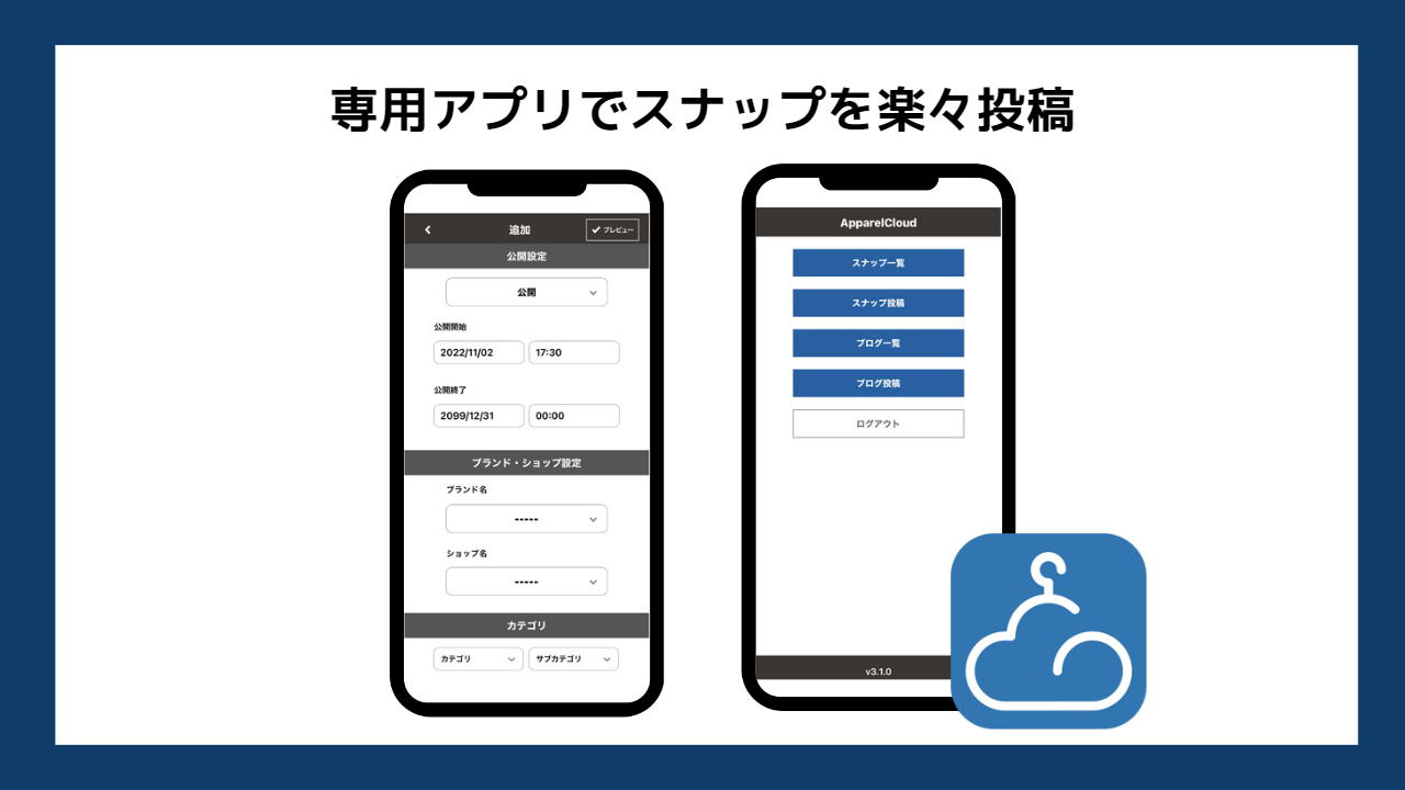 「スタスナ from APPAREL CLOUD」は、販売員のスナップをECサイトに表示させ、オンライン接客を可能とするツールです。同ツールの導入によって、ECサイトの売上貢献だけではなく、販売員スナップをきっかけにした実店舗への送客・集客促進も実現します。また、投稿専用アプリを使うことによって、店舗から簡単に投稿ができる他、店舗や販売員毎の売上貢献度をレポート化する機能も搭載されています。