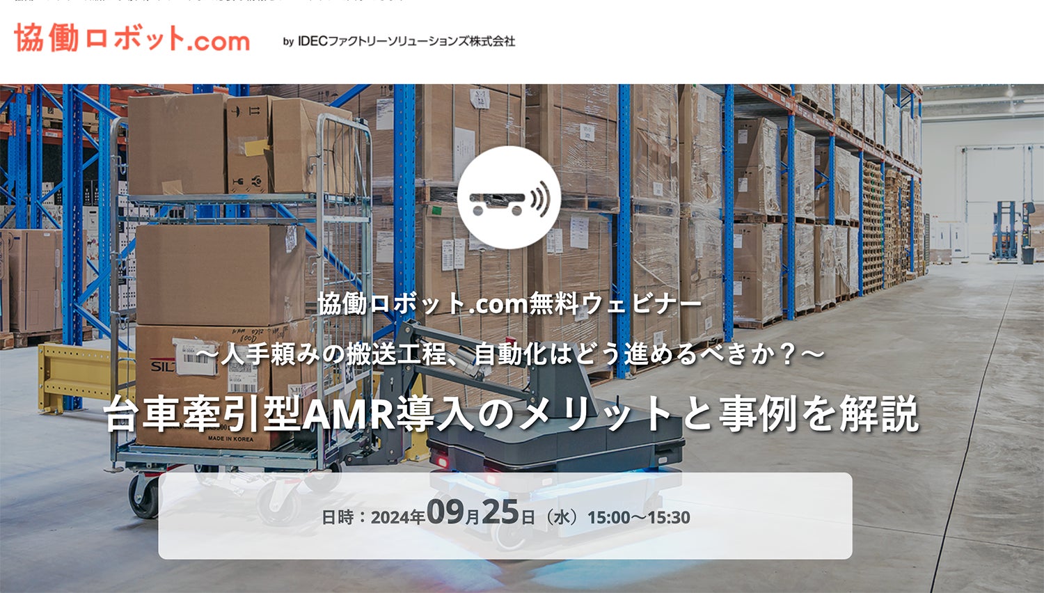 協働ロボット.com 無料ウェビナー「搬送工程の自動化はどう進めるべきか?牽引型AMR導入のメリットと事例を解説」 9/25(水)実施【参加申込受付中】