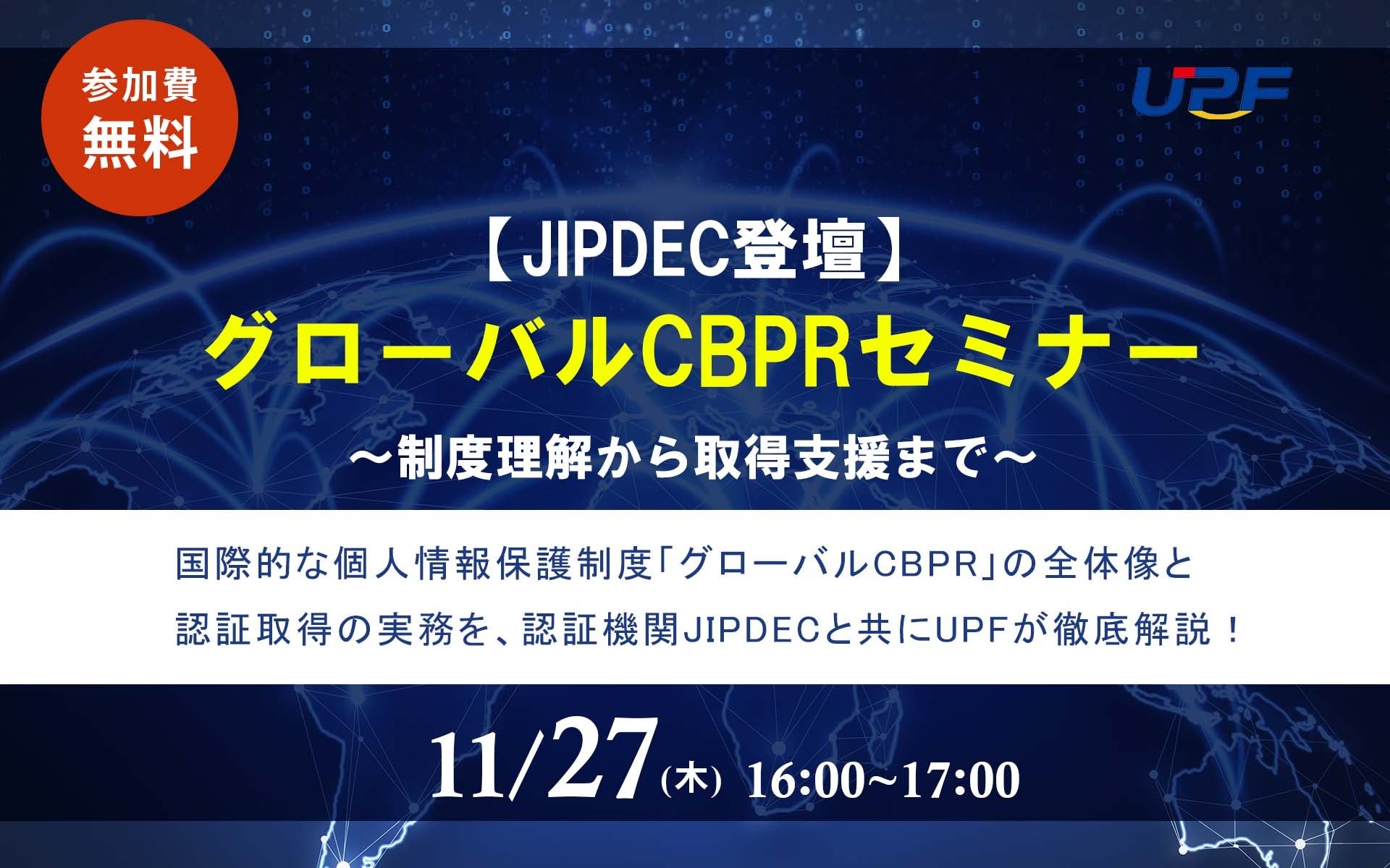 リスクマネジメント分野のコンサルティングサービスを提供する株式会社UPF(本社:東京都中央区、代表取締役:仲手川 啓、以下当社)は、一般財団法人日本情報経済社会推進協会(JIPDEC)をゲストに迎え、『グローバルCBPR(Global Cross-Border Privacy Rules)』の仕組みや取得プロセスを解説する無料オンラインセミナーを、2025年11月27日(木)に開催します。