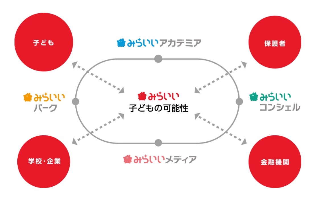 株式会社miraii では「みらいいパーク」のほか、オンライン教室「みらいいアカデミア」、家族のライフプランサポートアプリ「みらいいコンシェル」、次世代教育メディア「みらいいメディア」の開発、運営を行っています。4つのサービスを相互にリンクさせることで子どもの可能性開花を目指します。