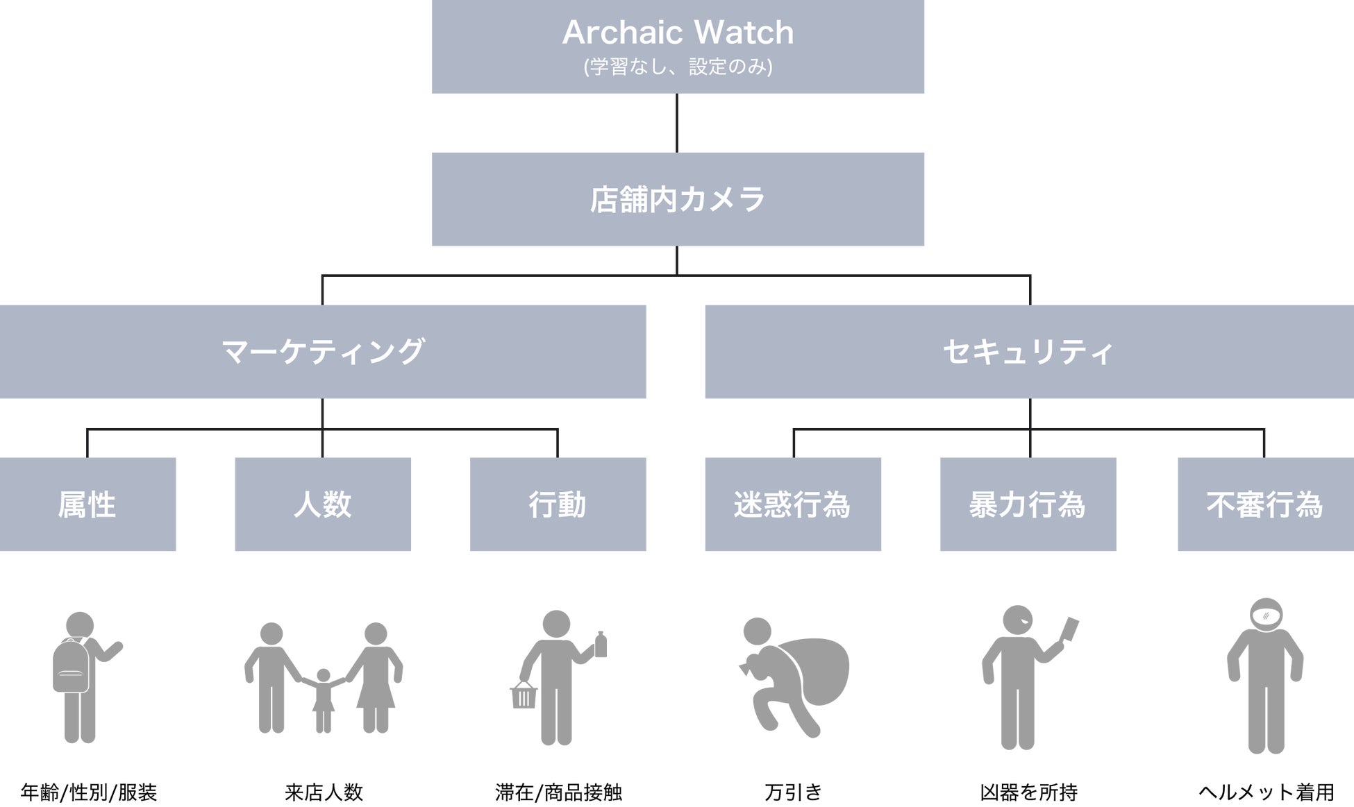 Archaic Watchは学習データが不要なため、マーケティングとセキュリティの両方を同時に実施することができます。これにより、店舗や施設のセキュリティ強化と顧客行動の解析を同時に行うことが可能です。