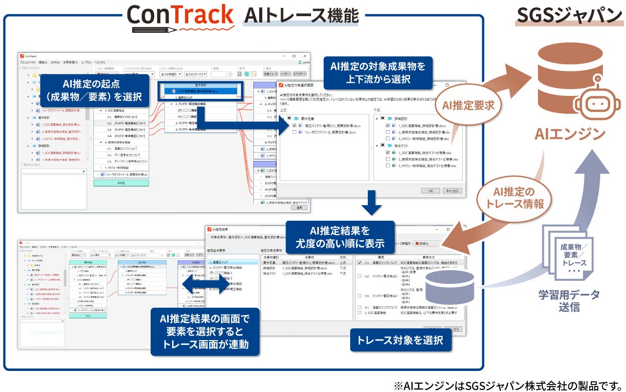 ConTrackは、SGSジャパンのAIエンジンと連携させて開発した、成果物間のトレース先候補を自動的にリコメンドするAIトレースにより、既存の設計成果物間のトレース作業を効率化させ、大規模システムの品質向上・効率的な開発を支援いたします。