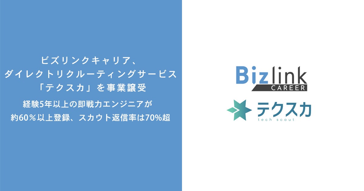 ITプロ人材のマッチングプラットフォーム「Bizlink(ビズリンク)」を運営する株式会社ビズリンクの子会社である株式会社ビズリンクキャリア(本社:東京都品川区、代表取締役社⻑:姜 大成、以下「ビズリンクキャリア」)は株式会社Work with Joy(本社:東京都品川区、代表取締役社長:新保 博文、以下「Work with Joy」)が運営するエンジニア特化型ダイレクトリクルーティングサービス「テクスカ」の事業譲受を基本合意しました。今後は人材エージェント向けにも利用可能なサービスへと展開していくことで、企業が抱えるIT人材不足の解決を目指します。