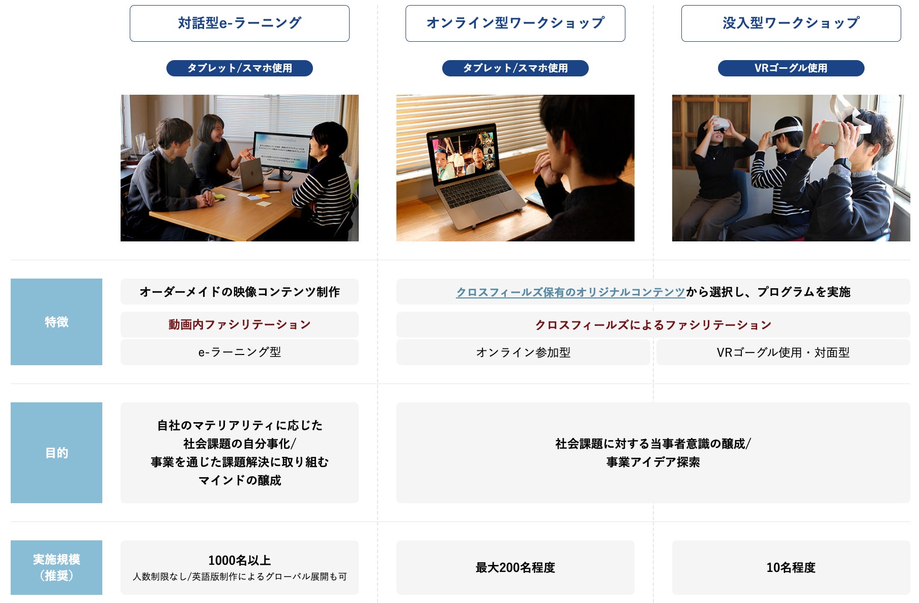 そして3つ目が「没入型ワークショップ」です。これはVRゴーグルを使用してまさに社会課題の現場に「没入する体験」を通じて、当事者意識を醸成していくものです。本プログラムもクロスフィールズのオリジナルコンテンツを使用します。「VRゴーグルを活用して高い没入体験を得たい」といったニーズに対応した少人数向けプログラムです。