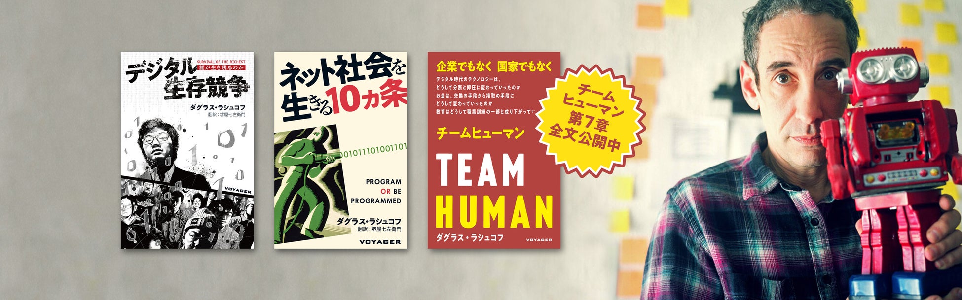 『デジタル生存競争』のヒットを記念して、D・ラシュコフの『チームヒューマン』の第7章#45〜#52を公開します。ぜひ読んでください。そして感想を寄せてください。ボイジャーは、本は読者が読んで初めて完成する、そんな風に思っています。みなさまの感想はD・ラシュコフとも共有し、デジタルで公開する予定です。
