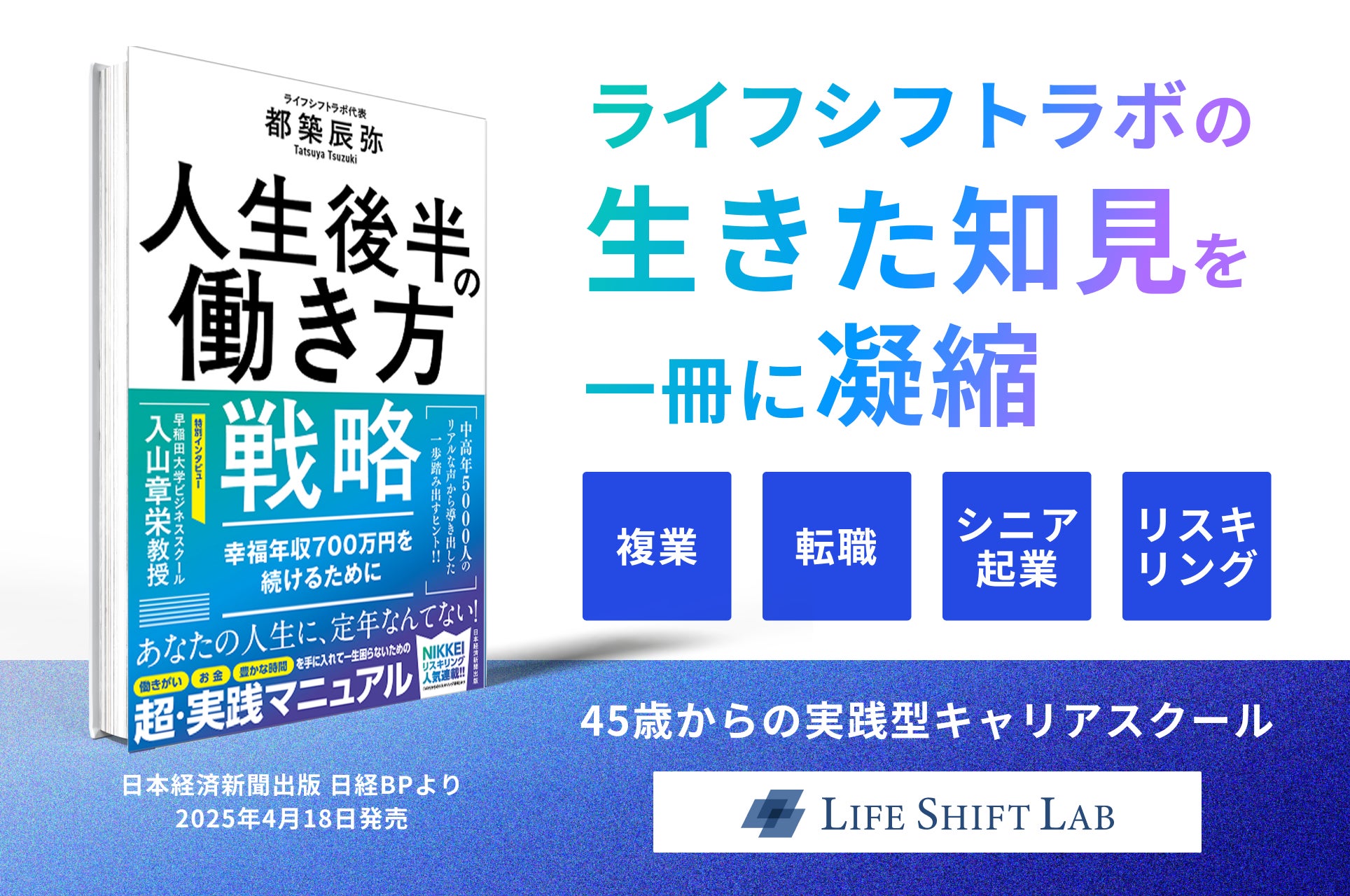45歳からの実践型キャリアスクール「ライフシフトラボ」を運営する株式会社ライフシフトラボ(代表取締役:都築辰弥、本社:東京都港区、以下「当社」)は、代表の都築辰弥による新刊『人生後半の働き方戦略 - 幸福年収700万円を続けるために』を2025年4月18日(金)に日経BP 日本経済新聞出版より発売します。