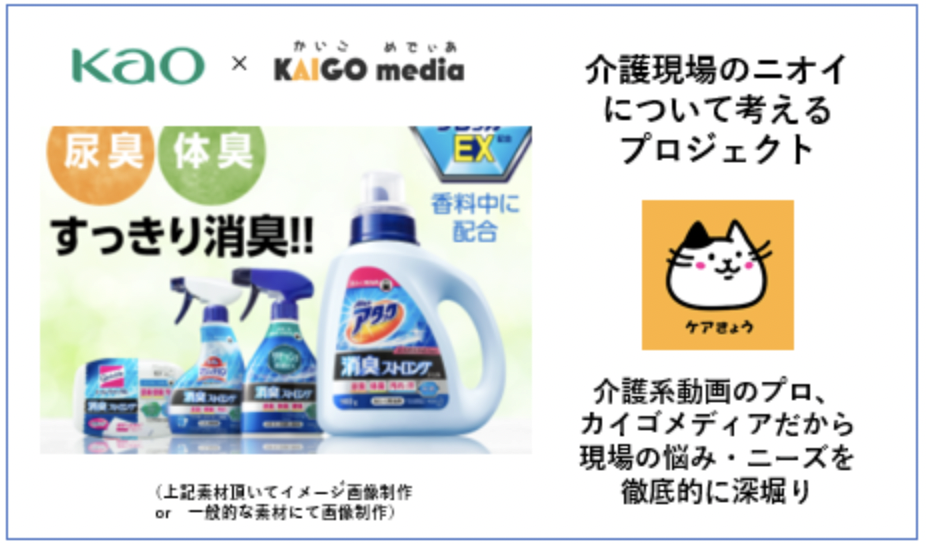 数多くのお客様から支持されている花王「消臭ストロング」と、介護領域に特化した動画・SNSメディアを展開し、多くの介護職の方から支持をされているカイゴメディアだからこそ、介護現場のニオイを徹底的に深掘るプロジェクト・情報配信が実現いたしました。