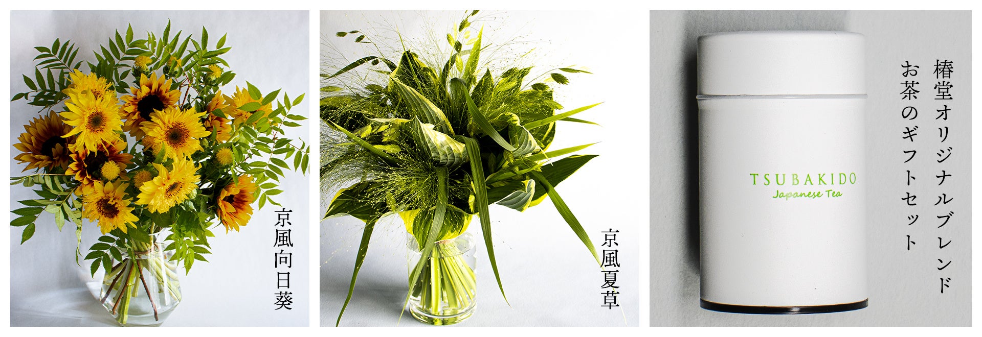 2種類とも京都の茶舗「椿堂」オリジナルブレンドの水出し前茶とセットでお届け。大切な方への日頃の感謝の気持ちをお届けする、特別なフラワーギフトはいかがですか?