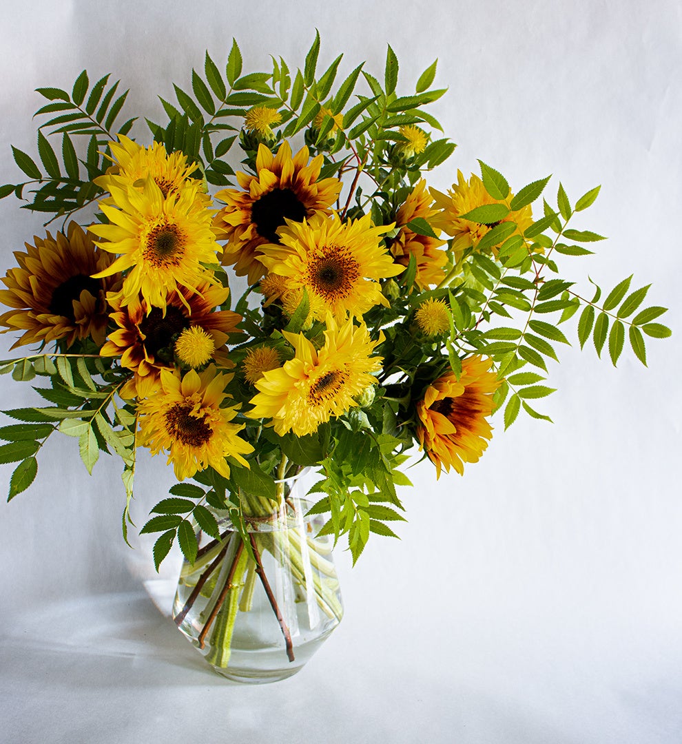 シックな色合いで珍しい品種の向日葵と、涼しげな枝や黄色の小花を組み合わせて