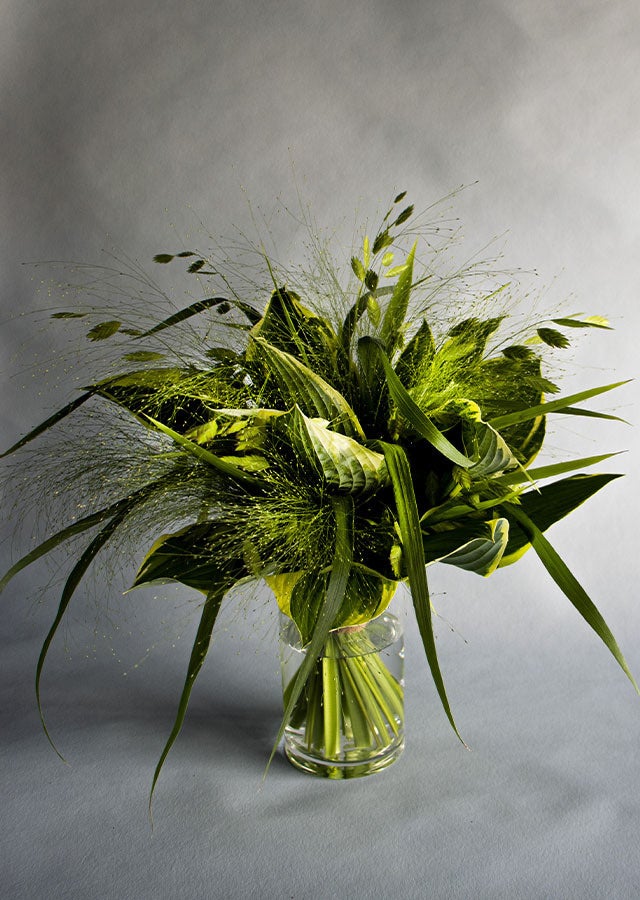 様々な色や形の夏草を集めて、スタイリッシュで涼しげなブーケを束ねました。 上質で特別なひとときを演出いたします。