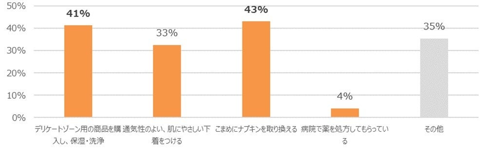 1位は「ナプキンをこまめに取り換える (43%) 」、次いで「デリケートゾーン用の商品を購入し、保湿・洗浄 (41%) 」、そして「通気性のよい、肌にやさしい下着をつける (33%) 」と続く結果になりました。