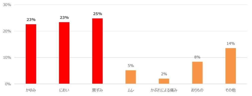 「デリケートゾーンに関する、最も気になる悩みをお答えください」と質問したところ、一番多かった回答は「黒ずみ」の25%、次いで「におい」23%、「かゆみ」23%と同率で続きました。